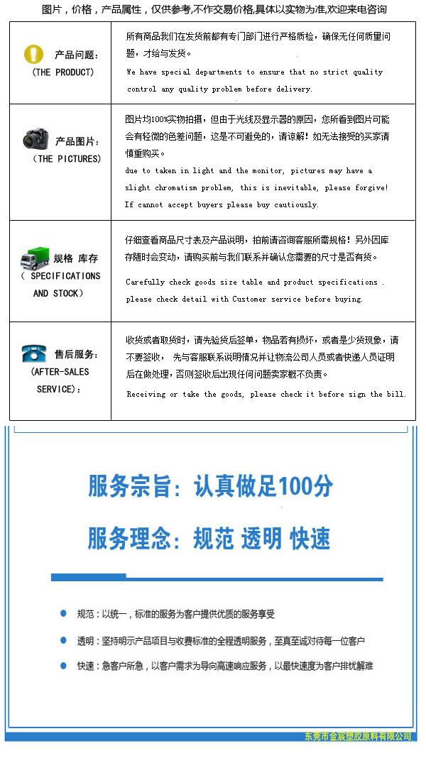 本公司原料25公斤起订,批量可折扣,款到发货或货到付款,珠三角一天内到达,国内各地3-4天到货. 特别声明:因塑胶行情每天都会有变更,页面上有些报价可能会与当天实际报价有所差异,请用手机或电话直接询价。感谢您的大力支持。 郑重承诺:本公司所售原料均为原厂原包装正牌料,杜绝一切副牌料,水口料以次充好运费说明: ★ 支持物流,快递和货运; 支持现金,银行转账。 ★ 本司原料低于500KG,不承担运费,订货500KG以上珠三角地区可送货上门; 省外客户物流,快递或货运; 不便之处敬请谅解! ★ 选用物流或者快递的买家,请先确认当地是否有该物流或快递的营业网点。 ★ 原料到厂后,请不要拆外包装,应先仔细检查原料的外包装是否完好及原料型号是否与您所订购原料型号相匹配。 ★ 货物送达后,请当面检查,若物流过程中出现大量包装损坏及原料外漏的,请让物流人员出具证明并保存,并立即与我们联系。 ★ 我们承诺期限内发货,但对承运人效率无法作出保证,如果物流快递超出3天,货运超出5天,请联络我们协助查询。 ★ 买家也可以根据交易状态中填写的单号信息,自行联系承运方,以便第一时间获知详细信息。 ★ 本公司原料售后的注塑加工由客户负责,如需帮助,我公司工程部将竭尽所能与您共同协商处理。